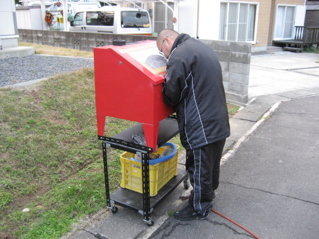 タイヤ交換の合間に、特攻隊長の弟M氏は、シャリーエンジンのヘッドをブラスト中! 落ちる!落ちる!と、喜んで作業に夢中! (かなり、満足げ!)