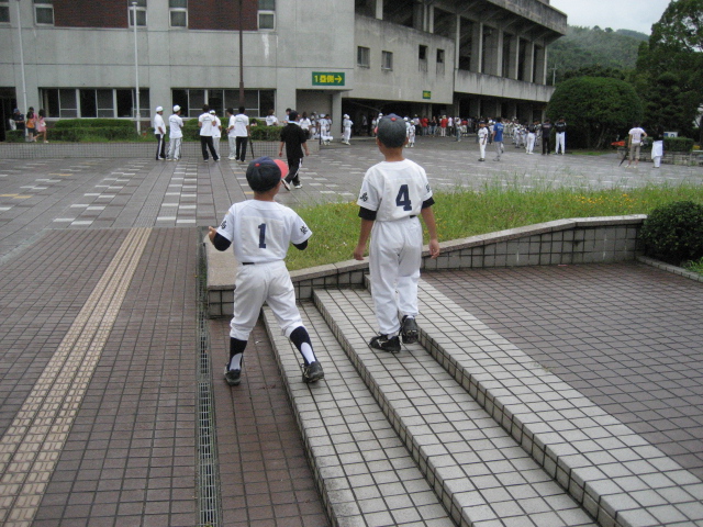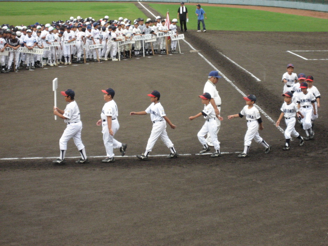 うちの息子が所属しているチームへ、地元のもう一つのチームがメンバーが足りないので、選手を貸して欲しいと言うことで、3年生のうちの息子と、もう一人の二人が選ばれた。 堂々の入場行進。なんとエースナンバー。 何でも1番と言うのは良いものだ。 わたしも、頑張ってお父さんしています。