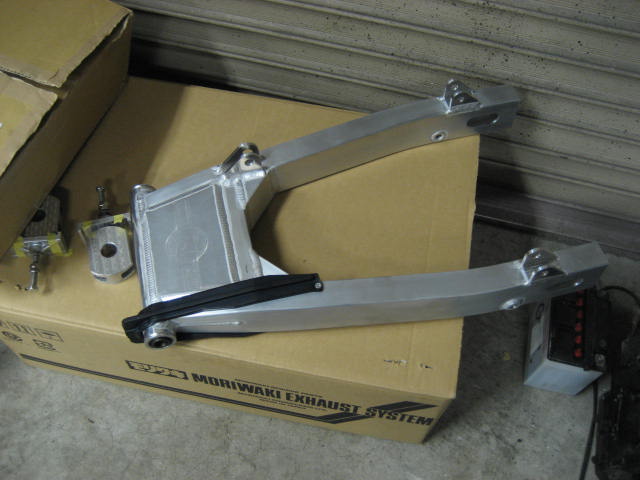 引き続き、先日カウル等を付けたMK2が、スイングアームのブッシュがガタガタなので、この際モリワキのスイングアームに交換する!