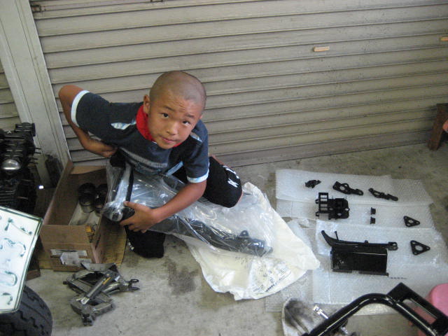 箱から、モリワキ角鉄スイングアームを取り出す息子!