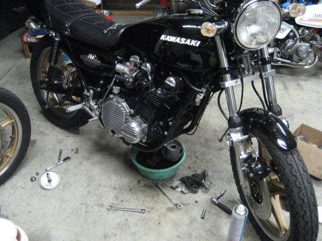 ついでに私の車両Z1のオイル交換と、エレメントの交換をする事にした。そのついでに、マフラーの塗装・タコメーター取り出し口のOリングとシール交換もする。