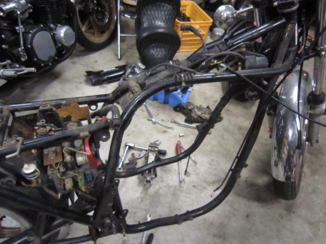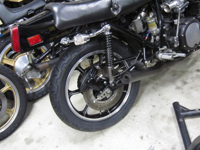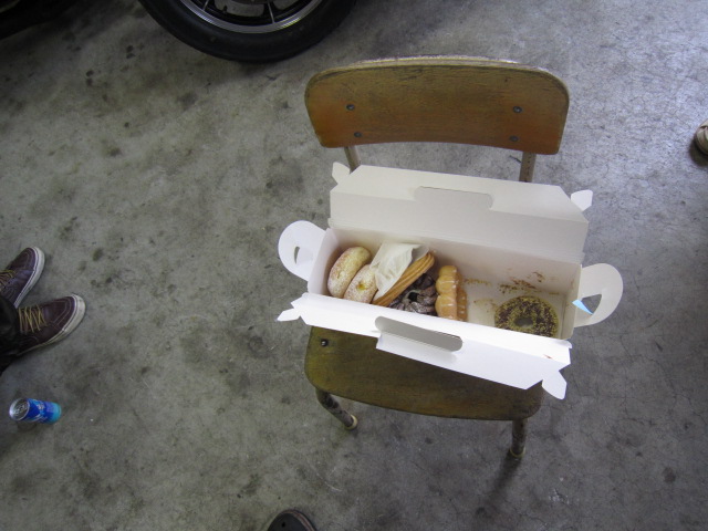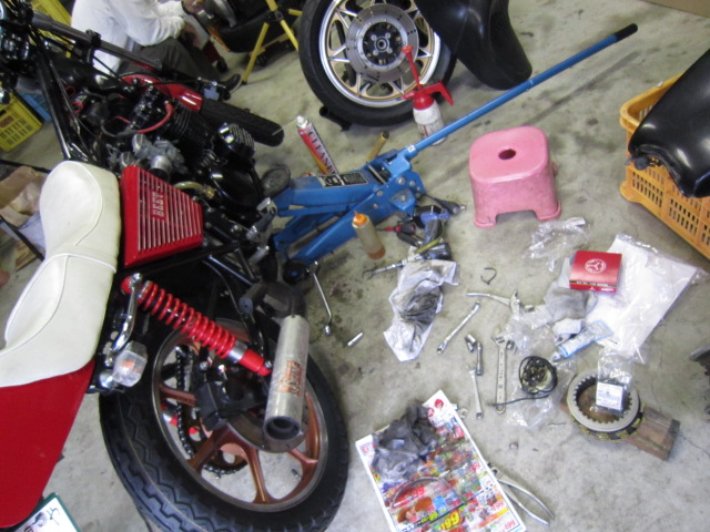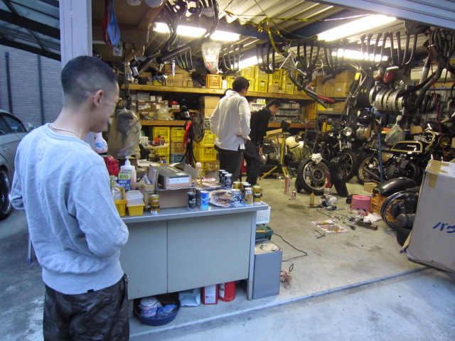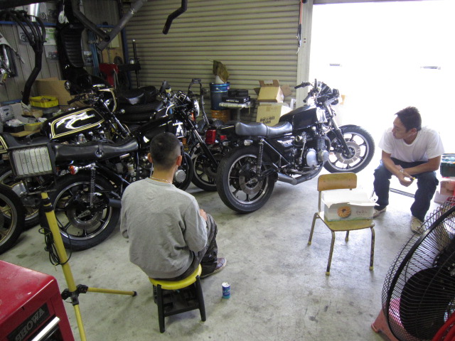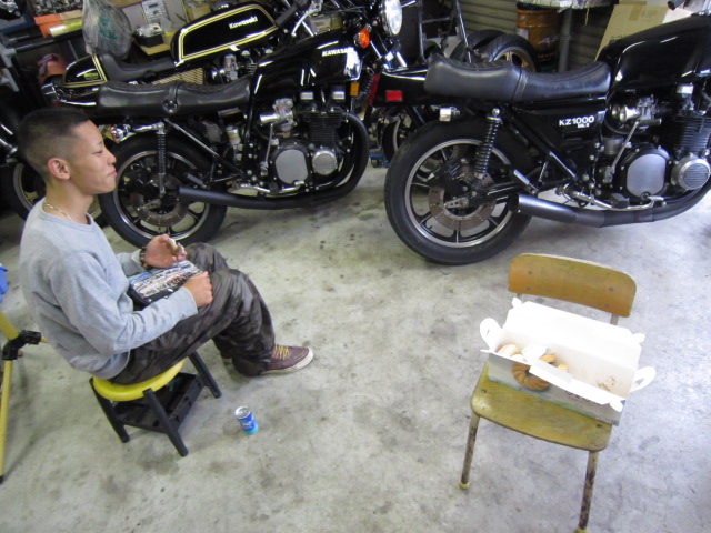 すると、Z400FXのタイヤ交換・クラッチ板交換・ポイント交換にやってき、作業開始です。のどかな休憩終了です。