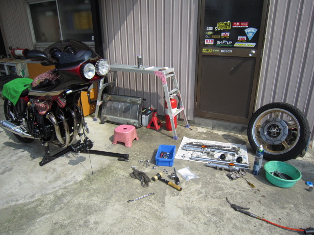ん~仕方ないので始めます。が、ガレージ内いっぱいで外での作業・・・・熱い非常に熱い