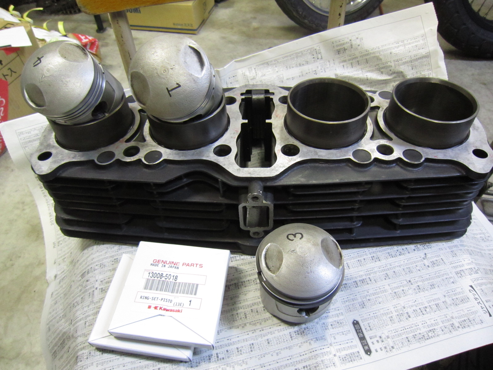 シリンダーの程度が良く、ノーマルピストンでも十分使用出来る許容範囲であったので、純正のピストンリングを取り寄せ組上げます。 けど・・・リング高過ぎ~。