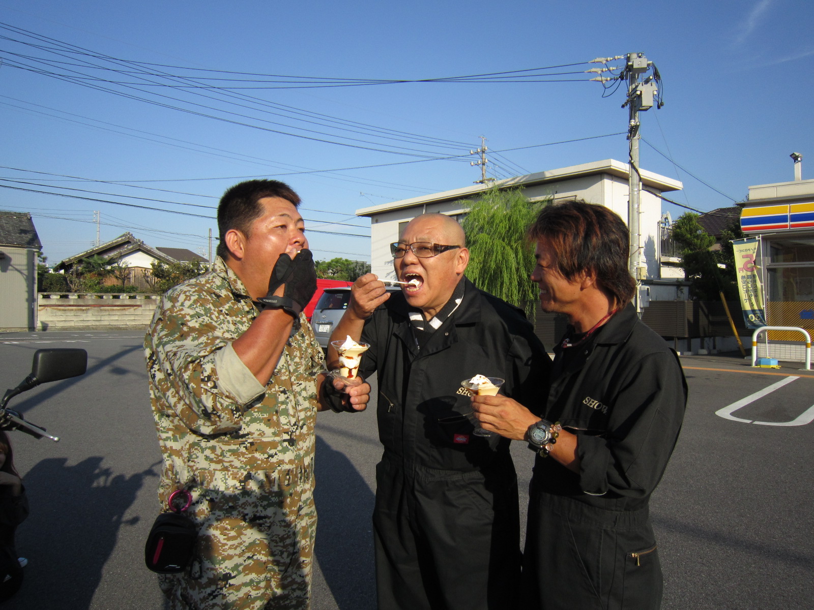 ホテル近くのコンビニで、仲良く3人でプリンパフェで乾杯です。