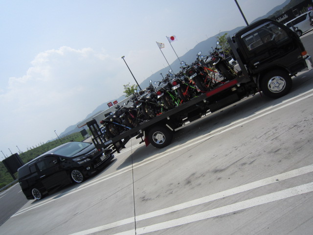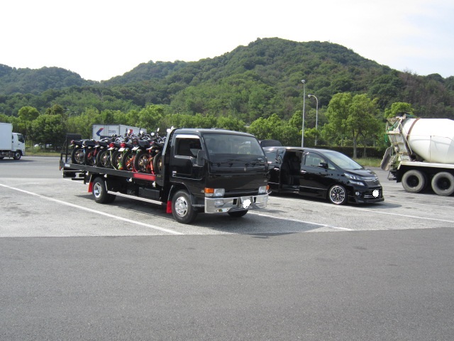 さぁー出発という時に・・・ウルフの車両に異変が・・・ヒューズが切れエンジンの始動が不可能となったので、残念だがホテルの積車の上において平野君とタンデムで現地に向かうことになった。