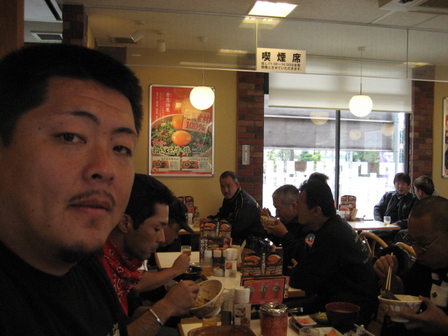 CAROLさん達との合流まで時間があるので、朝食を食べに、全員で移動。 『すき屋さん』皆悪げーな顔で、丼にかぶり付いていた。皆腹減っとったんやなー! 『皆食いよるのに、ワイの何時になったら来るんや!!』
