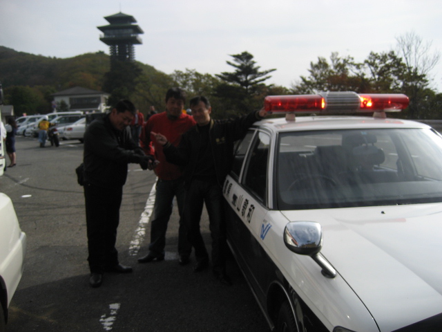峠での事故の現場検証に来ていたお巡りさんと写真撮影。(パトカーも!) しかし、仲良く一緒に写しているが、時には敵となり嫌な奴だ。俺はやっぱりポリが嫌いだ!!!