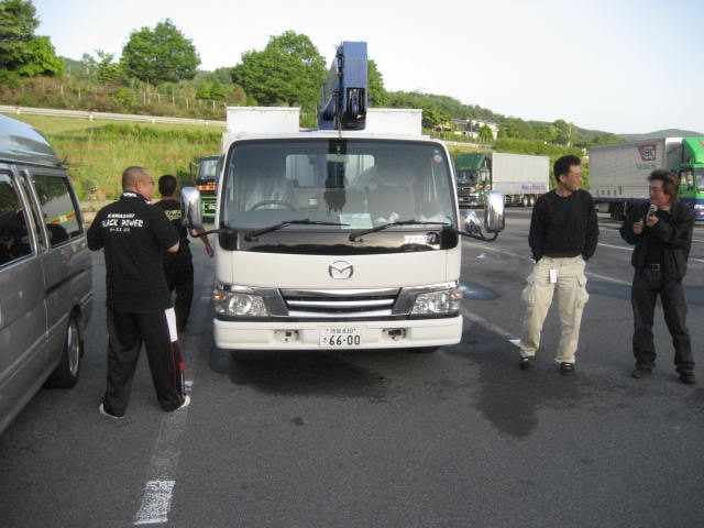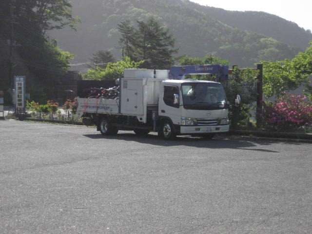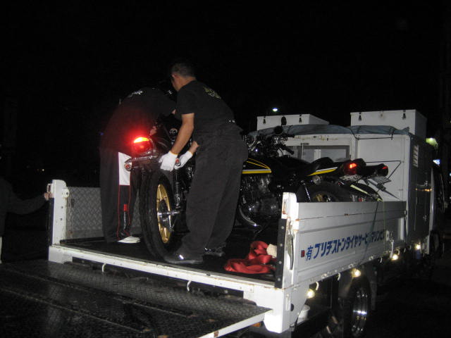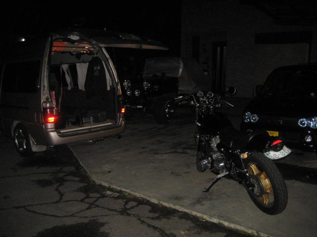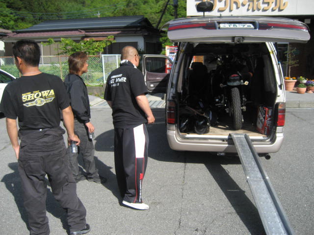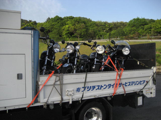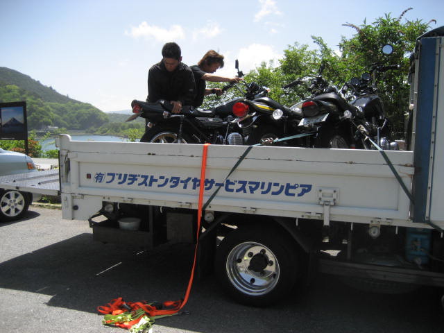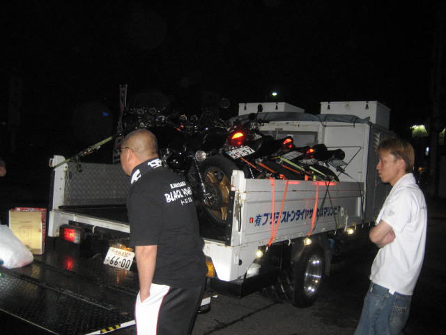 5月25日(金)天気の都合、集合時間を夜10時より11時に変更した。どうにか雨も上がり、川内のホームセンター駐車場にて、単車の載せこみにかかる。