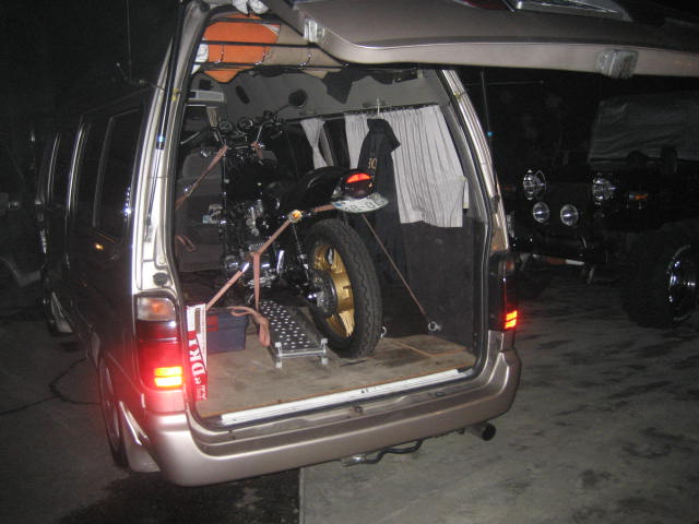 私の寝る場所作りに、ハイエースから私の単車を下ろしておくことに。