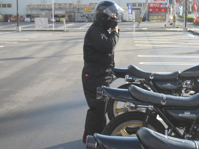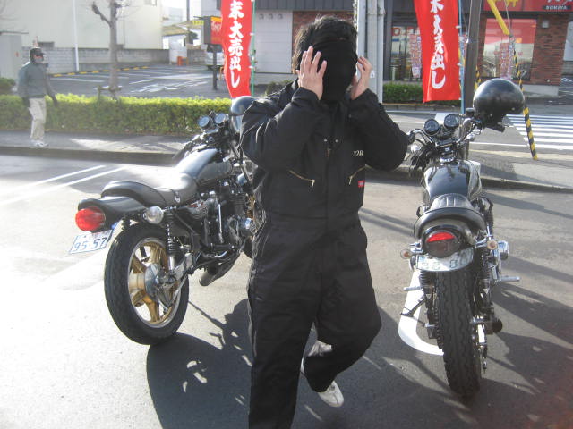最後なので、ツナギ?革ジャン革パン?と思ったが、あまりの寒さに大きめのツナギの下にジャージを穿き、上はダウンジャケットで参加を決めた。